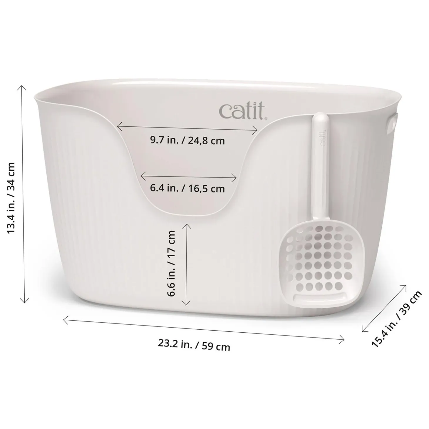 Catit White Loo Litter Box & Scoop is an easy entry cat litter box, that’s practical, open, with beautifully flowing, natural curves. Thanks to its simplicity, the Catit Loo offers cats enough room to dig, turn, and bury their business – all within a fairly compact footprint. It is made of 99% post-consumer recycled plastic, helping to minimize plastic waste and support the reuse of materials that would otherwise end up in landfills. In addition, the litter box is BPA-free. It includes a matching scoop you can hang from the top by the handle, designed so the scooper won’t touch the box. The narrow indentation within the scoop catches small particles that would otherwise fall back in through the openings.