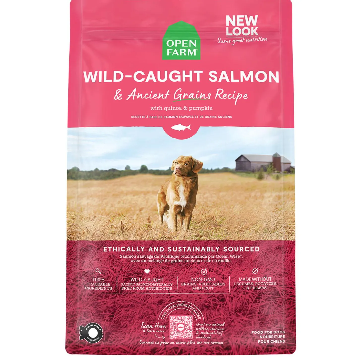 Open Farm Wild-Caught Salmon & Ancient Grains Recipe Adult Dog Food is a premium kibble that is nutrient-dense and packed with omega-3 fatty acids. This is thanks to a mix of wild-caught Ocean Wise approved fresh salmon, superfoods, and ancient grains to support your dog’s overall health. Free of peas, potatoes, corn, wheat, soy, and legumes.