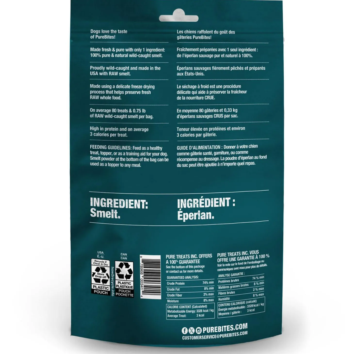 PureBites Wild Caught Smelt Freeze Dried Dog Treats are the ultimate high-value, exotic protein treat or topper. Made with only 1 simple human grade ingredient you can read, pronounce, and trust: 100% pure wild-caught smelt. Nothing else. No artificial colours, fillers, or sweeteners. Proudly sourced and made in the USA using a delicate freeze drying process that helps preserve fresh Raw whole food, locking in the taste dogs crave and high protein / low calorie nutrition that pet parents love. Freeze dried treats are a great complement to a Raw diet since they retain many of the benefits of Raw without the hassle of refrigeration.
