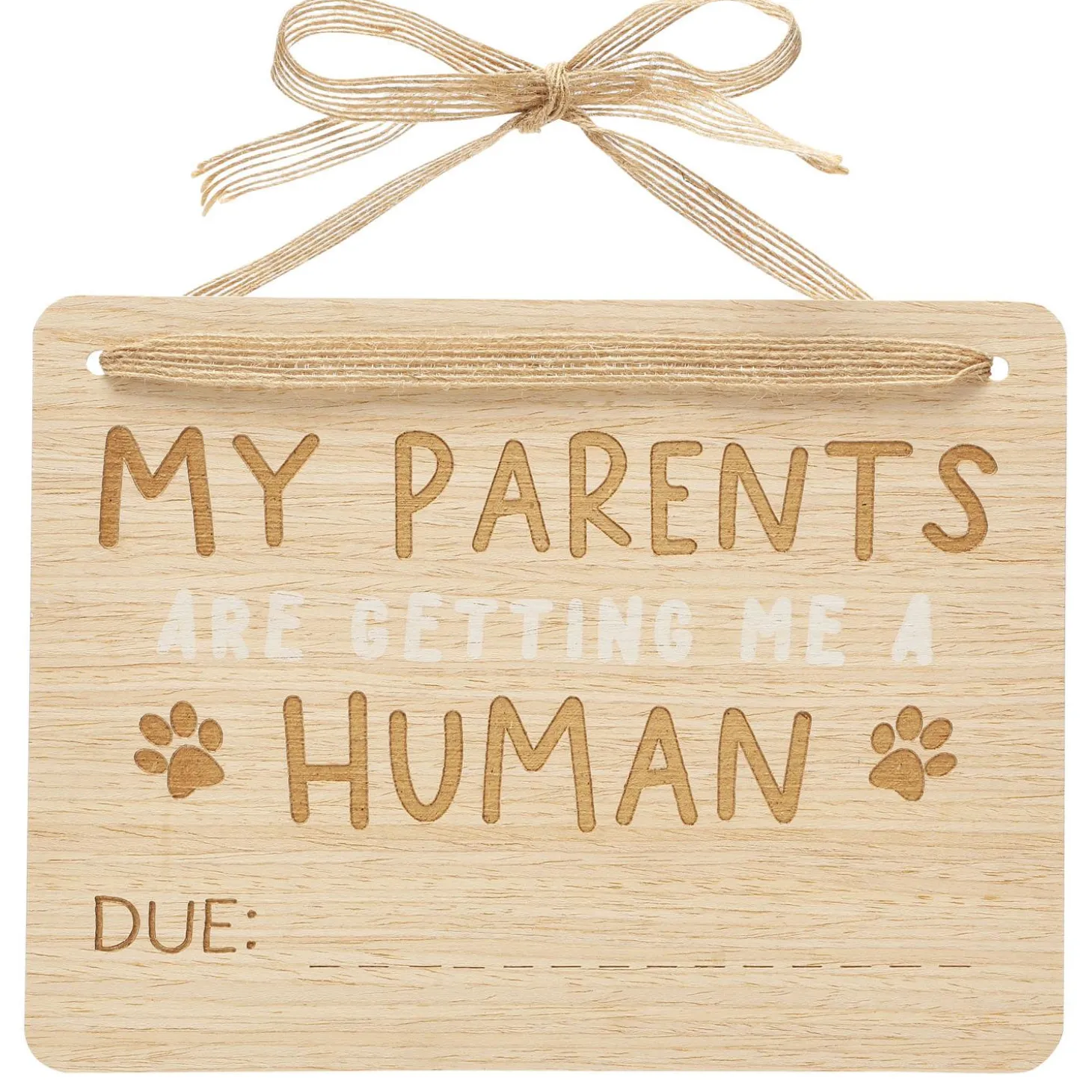 Use: Simply personalize this baby announcement with your soon to be baby’s due date using the included black marker and hang the finished product around your pups neck with the included burlap string and bow.