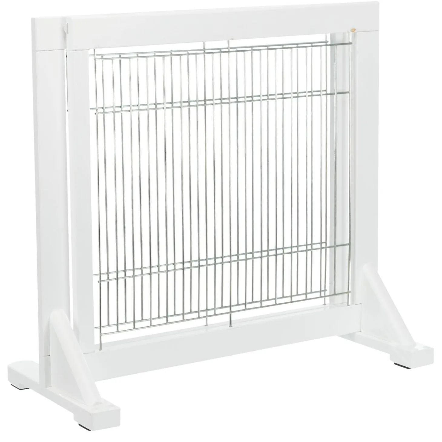Trixie Wooden White Pet Gate is used to restrict access to rooms and stairs. It includes small walk-through door with closure for passage of smaller pets. It is made with glazed pine, galvanized metal bars and rubber material. Non-slip rubber feet keep the gate in place. Installation is very easy and requires no drilling into walls or door frames. Adjustable with closable opening in grid as passage for cats and small dogs.