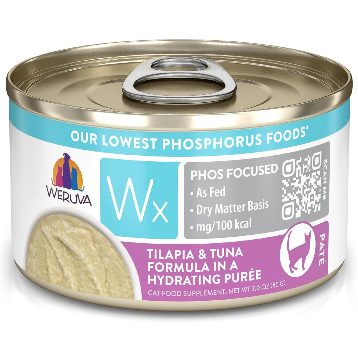Weruva Wx Phos Focused Tilapia & Tuna Formula Pate Adult Cat Food features naturally low phosphorus proteins like tilapia, tuna, and egg whites, this formula is designed for high palatability while helping to maintain muscle mass. With up to 50% less phosphorus than AAFCO’s minimum levels, Weruva Wx Phos Focused formulas are intended for intermittent or supplemental feeding, providing essential nutrition for cats in need.