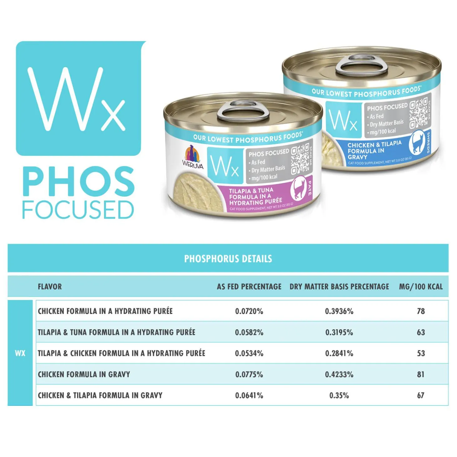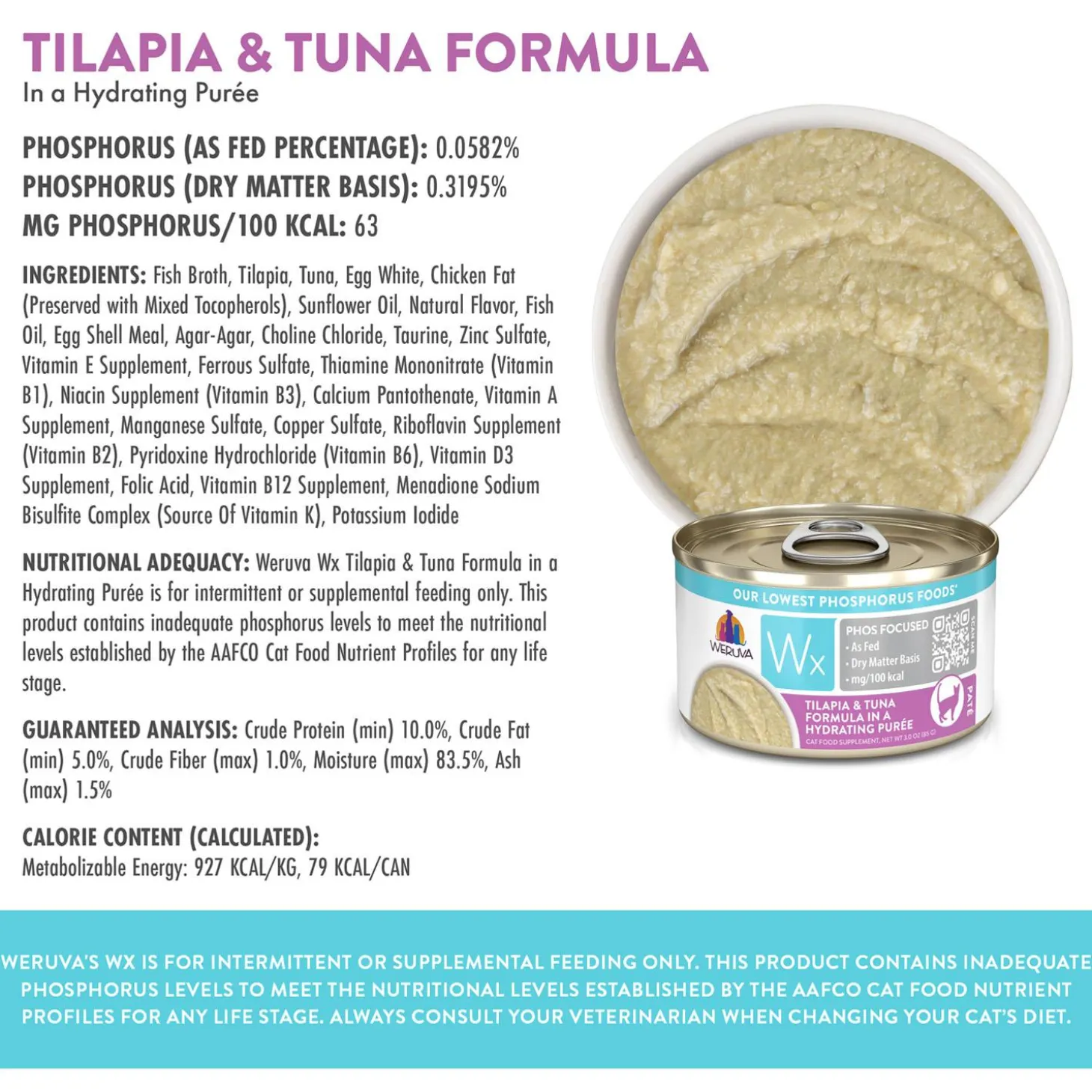 - Weruva Wx Phos Focused is for intermittent or supplemental feeding only. This product contains inadequate phosphorus levels to meet the nutritional levels established by the AAFCO Cat Food Nutrient Profiles for any life stage. Always consult your veterinarian when changing your cat’s diet